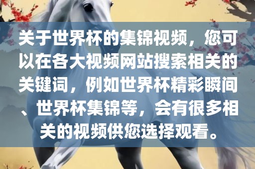 关于世界杯的集锦视频,您可以在各大视频网站搜索相关的关键词,例如世界杯精彩瞬间、世界杯集锦等,会有很多相关的视频供您选择观看。