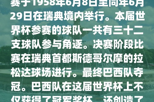 1. 比赛时间,1958年瑞典世界杯是第6届世界杯足球赛事。比赛于1958年6月8日至同年6月29日在瑞典境内举行。本届世界杯参赛的球队一共有三十二支球队参与角逐。决赛阶段比赛在瑞典首都斯德哥尔摩的拉松达球场进行。最终巴西队夺冠。巴西队在这届世界杯上不仅获得了冠军奖杯,还创造了著名的桑巴军团,为后来的足球历史留下了深刻的印记。