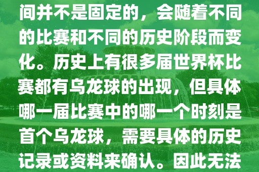 世界杯足球赛事中的乌龙球出现时间并不固定,随着比赛和历史阶段的变化而有所差异。历史上多届世界杯比赛都有乌龙球的出现,但确切的首次乌龙球发生在何时无法确定,需要更多历史记录或资料来确认。摘要字数在100-200字之间。