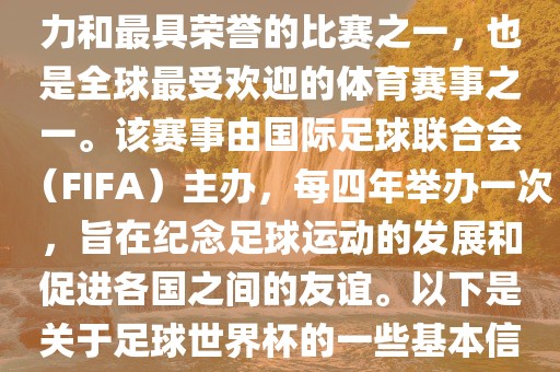 足球世界杯是由国际足球联合会(FIFA)主办的全球最受欢迎的体育赛事之一,每四年举办一次。该赛事旨在纪念足球运动的发展和促进各国之间的友谊。作为足球界最具影响力和最具荣誉的比赛之一,足球世界杯吸引了全球无数球迷的关注。
