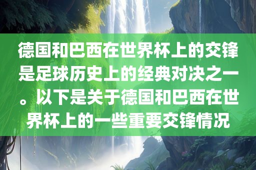 德国和巴西在世界杯上的交锋是足球历史上的经典对决之一。以下是关于德国和巴西在世界杯上的一些重要交锋情况