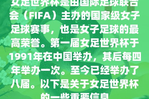 女足世界杯是由国际足球联合会(FIFA)主办的国家级女子足球赛事,也是女子足球的最高荣誉。第一届女足世界杯于1991年在中国举办,其后每四年举办一次。至今已经举办了八届。以下是关于女足世界杯的一些重要信息