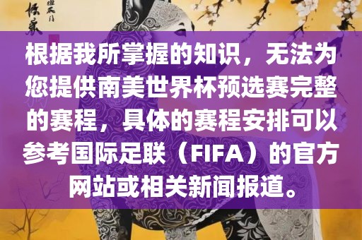 摘要:本文简要提及无法提供南美世界杯预选赛完整赛程的情况,建议读者可以参考国际足联的官方网站或关注相关新闻报道以获取具体的赛程安排。