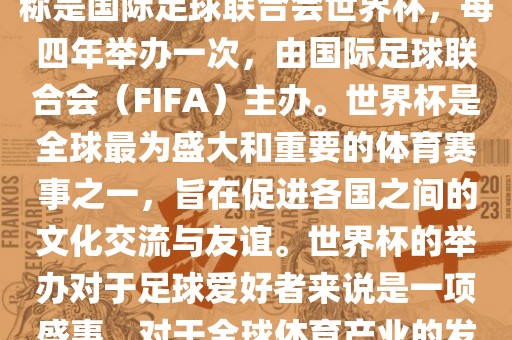 世界杯是国际足球联合会主办的一项国际足球赛事,每四年举办一次。作为全球最盛大的体育赛事之一,世界杯旨在促进各国之间的文化交流与友谊。对于足球爱好者和全球体育产业来说,世界杯的举办具有重要影响,吸引了全球无数观众和球迷的关注。