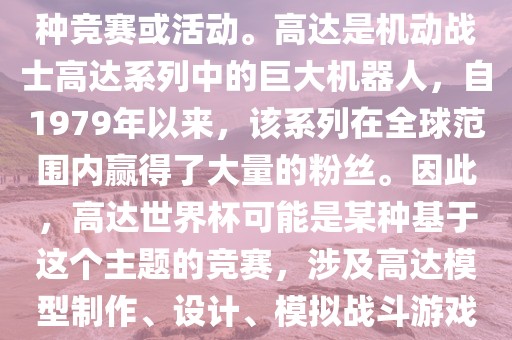 高达世界杯,通常指的是与高达这个知名动画系列相关的某种竞赛或活动。高达是机动战士高达系列中的巨大机器人,自1979年以来,该系列在全球范围内赢得了大量的粉丝。因此,高达世界杯可能是某种基于这个主题的竞赛,涉及高达模型制作、设计、模拟战斗游戏或与高达主题相关的其他活动。