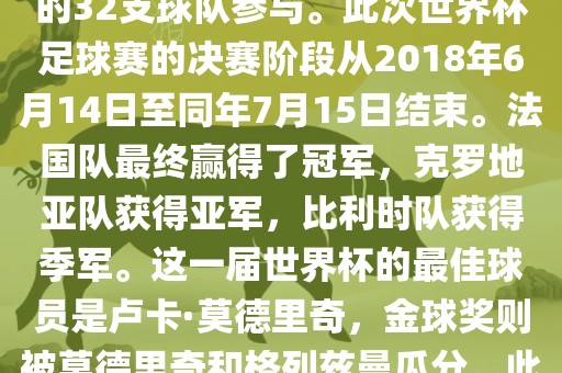 摘要:2018年俄罗斯世界杯是第21届足球赛事,全球32支球队参与。法国队赢得冠军,克罗地亚和比利时分别获得亚军和季军。最佳球员为卢卡·莫德里奇,金球奖被莫德里奇和格列兹曼分享。该届世界杯创造了多项纪录和亮点,观众人数创新高。