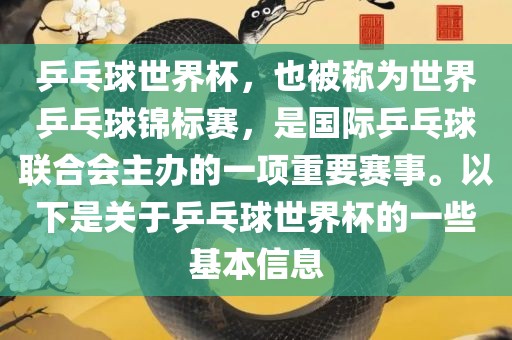 乒乓球世界杯,也被称为世界乒乓球锦标赛,是国际乒乓球联合会主办的一项重要赛事。以下是关于乒乓球世界杯的一些基本信息