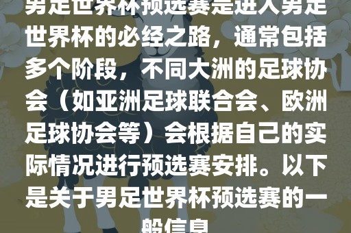 男足世界杯预选赛是进入男足世界杯的重要阶段,需要各支球队认真备战、全力以赴地参加比赛,对于足球迷来说,这也是观赏高水平足球比赛的好机会,如果想要了解具体的男足世界杯预选赛信息,可以关注相关足球协会或赛事官方的消息。