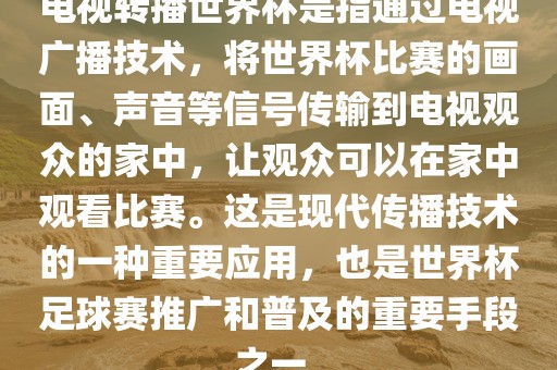 电视转播世界杯是指通过电视广播技术,将世界杯比赛的画面、声音等信号传输到电视观众的家中,让观众可以在家中观看比赛。这是现代传播技术的一种重要应用,也是世界杯足球赛推广和普及的重要手段之一。